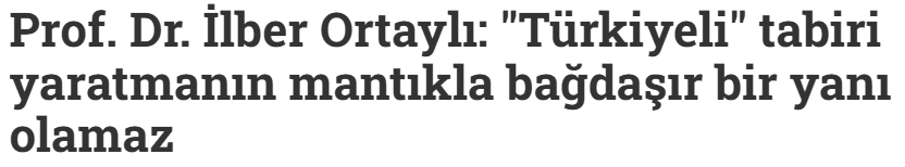 Türkiye konusunda asıl tartışılacak ve rahatsız edici manasızlık burada işte; bazı kişilerin uydurduğu ‘Türkiyeli’, ‘Türkiyelilik’ gibi deyimler! Bazı safdiller veya herkesi bir şey bilmiyor zanneden tipler; ‘Efendim ne var bunda, Amerikalı oluyor da Türkiyeli niye olmasın?’ diyorlar. Amerika, Kolomb’un keşfettiği kıtanın ayrı bir kıta olduğunun farkına varan Cenovalı kaptan Amerigo Vespucci’nin adından geliyor. Amerikalılık Anglo-Sakson göçü ve İngiliz dili etrafında oluşan göçmenler için uygun, Türkiye ise içinde Türk adı taşıyor, böyle bir benzerlikle ilgisi yok. Ülkemizin geniş ölçüde Türkleşmesinden beri, bir bölgenin böyle bir etnik kimliğe kavuştuğunu ecnebilerin bile görmesiyle kullanılan bir isim… ‘Türkiyeli’ ismi tercüme edilemez, içeriği bakımından bu kelimeyi teklif edenlerin amacını da zaten karşılamaz. Başka bir kimlik kullanmak isteyenler bu ifadeyi kullanabilirler ama bu amaçla ülke yurttaşlığının ve kimliğin adını değiştirmelerine lüzum yoktur, hakları olduğunu da zannetmiyoruz” şeklinde açıklamalarla tepki gösterdi. (Prof. Dr. İlber Ortaylı: “Türkiyeli” tabiri yaratmanın mantıkla bağdaşır bir yanı olamaz)