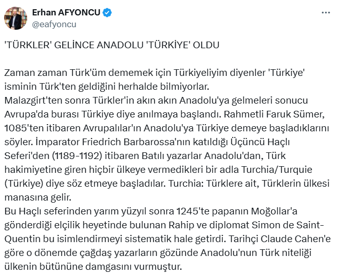 Milli Savunma Üniversitesi Rektörü, aynı zamanda tarihçi de olan Erhan Afyoncu, “Türkiyeli” kavramına; “’TÜRKLER’ GELİNCE ANADOLU ‘TÜRKİYE’ OLDU. Zaman zaman Türk’üm dememek için Türkiyeliyim diyenler ‘Türkiye’ isminin Türk’ten geldiğini herhalde bilmiyorlar. Malazgirt’ten sonra Türkler’in akın akın Anadolu’ya gelmeleri sonucu Avrupa’da burası Türkiye diye anılmaya başlandı. Rahmetli Faruk Sümer, 1085’ten itibaren Avrupalılar’ın Anadolu’ya Türkiye demeye başladıklarını söyler. İmparator Friedrich Barbarossa’nın katıldığı Üçüncü Haçlı Seferi’den (1189-1192) itibaren Batılı yazarlar Anadolu’dan, Türk hakimiyetine giren hiçbir ülkeye vermedikleri bir adla Turchia/Turquie (Türkiye) diye söz etmeye başladılar. Turchia: Türklere ait, Türklerin ülkesi manasına gelir. Bu Haçlı seferinden yarım yüzyıl sonra 1245’te papanın Moğollar’a gönderdiği elçilik heyetinde bulunan Rahip ve diplomat Simon de Saint-Quentin bu isimlendirmeyi sistematik hale getirdi. Tarihçi Claude Cahen’e göre o dönemde çağdaş yazarların gözünde Anadolu’nun Türk niteliği ülkenin bütününe damgasını vurmuştur.” şeklinde ifadelere yer verdiği paylaşımı ile tepki gösterdi.