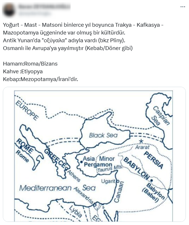 Yoğurt – Mast – Matsoni binlerce yıl boyunca Trakya – Kafkasya – Mazopotamya üçgeninde var olmuş bir kültürdür. Antik Yunan’da “οξύγαλα” adıyla vardı (bkz Pliny). Osmanlı ile Avrupa’ya yayılmıştır (Kebab/Döner gibi) Hamam:Roma/Bizans Kahve :Etiyopya Kebap:Mezopotamya/İrani’dir.